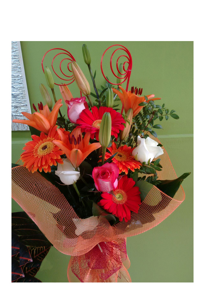 Ramo compuesto de liliums naranjas, gerberas rojas y naranjas, rosa blanca y rosa bicolor rosada y blanca, acabados con leder y hojas de aspidistra.