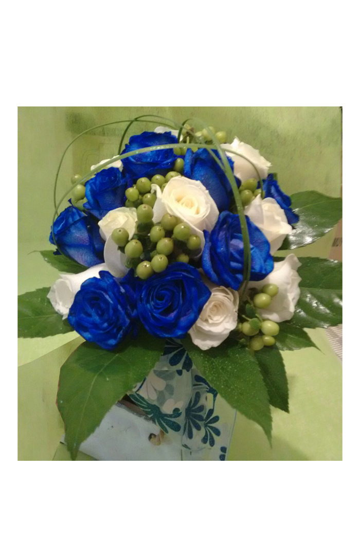 Bouquet de novia con rosas azules y blancas e hipericum verdes, acabado con hoja de aralia.